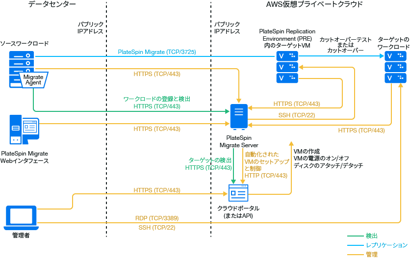 メモ:図 8-1は、自動検出およびWindowsワークロードとLinuxワークロードのネットワーク要件を示しています。別の方法として、ソースワークロード上でMigrate Agentを使用してワークロードを登録し、そのインベントリ詳細をHTTPS (TCP/443)経由でPlateSpin Migrateサーバに送信することができます。詳細については、セクション 2.6.2, ワークロード登録の要件を参照してください。