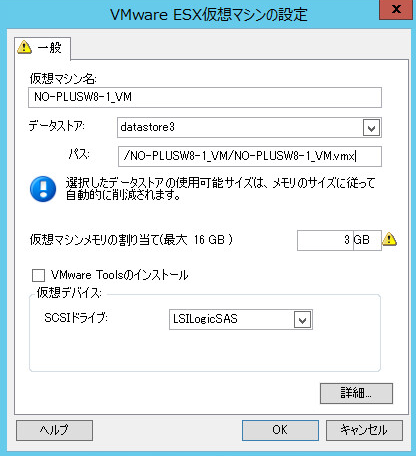 仮想マシン名: 新しい仮想マシン用の表示名を指定します。 データストア: *.vmxファイルを作成するデータストアを選択します。 設定ファイルのパス: 仮想マシンの*.vmx環境設定ファイルの名前およびディレクトリパスを指定します。 仮想マシンメモリの割り当て: 仮想マシンに割り当てられる仮想RAMの容量の値を指定します。 VMware Toolsのインストール: マイグレーション中にVM Toolsをインストールするには、このオプションを有効にします(推奨)。 SCSIドライブ: > BusLogicまたはLSIlogicのいずれかを選択します(推奨オプション)。 詳細: VMの詳細な環境設定を表示または変更するには、このボタンをクリックします。 |