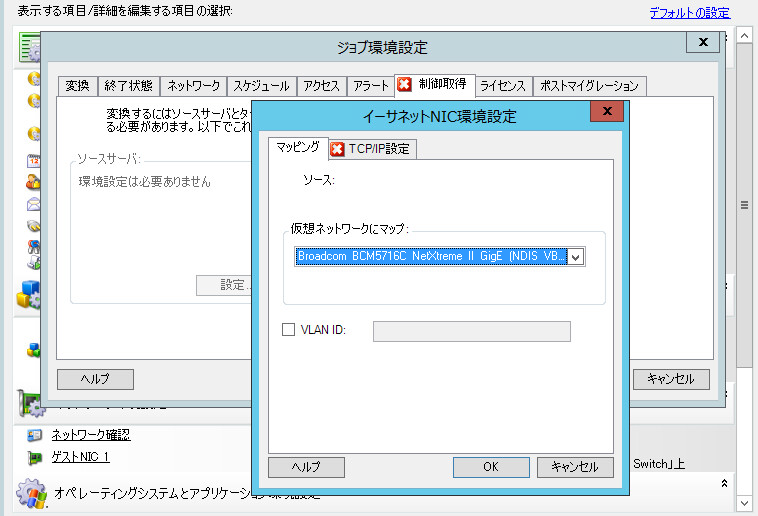 デフォルトでは、PlateSpin Migrateによって、ソース上で検出されたNICごとに仮想NICを作成するようなマイグレーションジョブが設定されます。マイグレーション後の接続のために、ターゲットの仮想NICがターゲットの仮想プラットフォーム上の適切な仮想ネットワークにマッピングされていることを確認します。