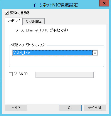 変換に含める: このオプションが選択されていると、PlateSpin MigrateによってソースNIC用の仮想NICが作成されます。 仮想ネットワークにマップ: ターゲットVM上で使用される仮想ネットワークを選択します。ターゲットVMがサーバと通信できる仮想ネットワークを選択します。 接続状態で開始: ESXターゲットマシンを開始する際に、仮想ネットワークインタフェースに接続するには、このオプションを有効にします。 VLAN ID: (Hyper-Vサーバ上のターゲットマシンにのみ適用)ターゲットマシン上で使用される仮想ネットワークIDを指定するには、このオプションを有効にします。このIDを指定していない場合は、ソースマシンの仮想ネットワークIDがデフォルトで使用されます。 TCP/IP設定タブ: クリックしてTCP/IPおよび詳細ネットワーク設定にアクセスします。TCP/IPおよび詳細ネットワーク設定を参照してください。 |