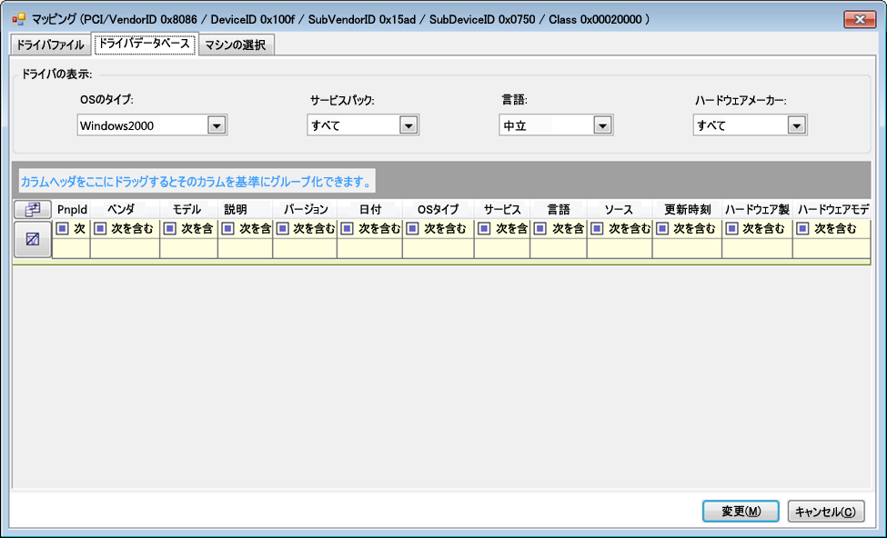 ドライバデータベースタブで、既存のドライバデータベースを参照して選択し、正しいPnP IDを選択して、変更を選択します。