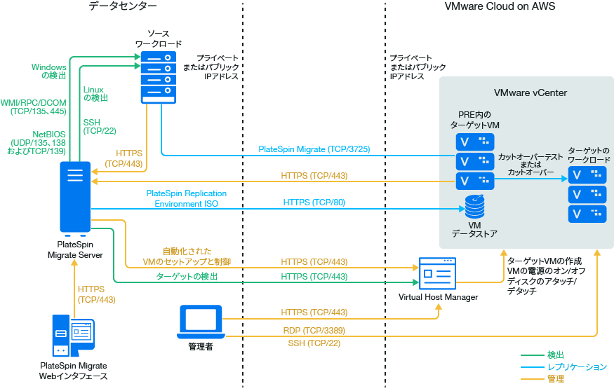 メモ:図 13-1は、自動検出およびWindowsワークロードとLinuxワークロードのネットワーク要件を示しています。別の方法として、ソースワークロード上でMigrate Agentを使用してワークロードを登録し、そのインベントリ詳細をHTTPS (TCP/443)経由でPlateSpin Migrateサーバに送信することができます。Migrate Agent使用時のネットワーク要件については、セクション 2.6.2, ワークロード登録の要件およびセクション 22.7, Migrate Agentによるワークロードの登録と詳細の検出を参照してください。