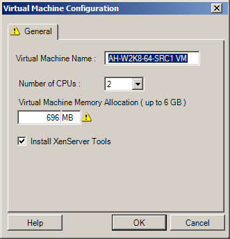 Virtual Machine Name: Specify the display name for the new virtual machine. Number of CPUs: Select the number of CPUs to assign to the target VM. For example, you can convert a single-processor workload to a multi-processor VM, or a multi-processor workload to a single-processor VM. Virtual Machine Memory Allocation: Specify a value for the amount of virtual RAM to be assigned to the virtual machine. Install XenServer Tools: Enable this option to install XenServer Tools during the migration process (recommended). |