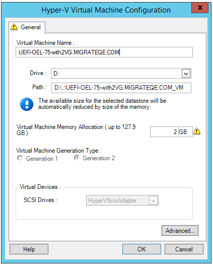PlateSpin Migrate displays target virtual machine configuration options specific to the selected target and also provides access to advanced configuration options. For information about host-specific configuration options, see Target VM Configuration: Microsoft Hyper-V