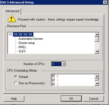 The following are configuration options specific to VMware ESX systems prior to vSphere 5. To access settings that control resource pools, the number of CPUs, and CPU scheduling affinity, click Advanced.