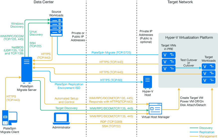NOTE:Figure 14-1 and Figure 14-2 depict automated discovery and the network requirements for Windows and Linux workloads. You can alternatively use Migrate Agent on the source workload to register the workload and send its inventory details to PlateSpin Migrate server using HTTPS (TCP/443). See Requirements for Workload Registration and Registering Workloads and Discovering Details with Migrate Agent.