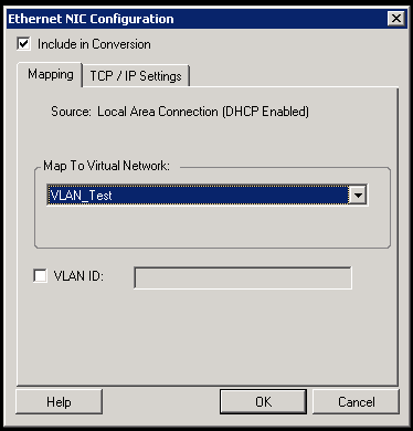 Include in Conversion: When this option is selected, PlateSpin Migrate creates a virtual NIC for a source NIC. Map to Virtual Network: Select the virtual network that will be used on the target VM. Choose a virtual network that allows the target VM to communicate with the server. Start connected: Enable this option to connect the virtual network interface when starting the ESX target machine. VLAN ID: (Applicable for target machine on a Hyper-V server only) Enable this option to specify the virtual network ID to be used on the target machine. If you do not specify this ID, then the virtual network ID of the source machine is used by default. TCP/IP Settings tab: Click the tab to access TCP/IP and advanced network settings. See TCP/IP and Advanced Network Settings. |