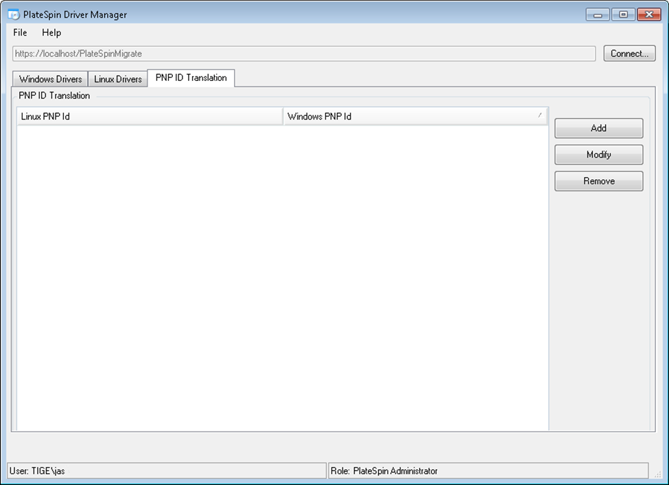 Launch the PlateSpin Driver Manager tool and connect to the PlateSpin Server.