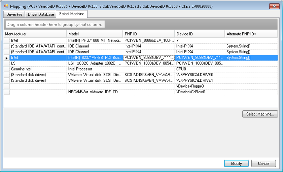 Under the Driver Database tab, browse to and select the existing driver database, select the correct PnP ID, then select Modify.