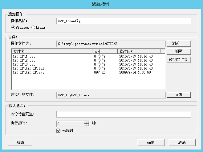 在默认选项部分,指定任何必要的命令行自变量以及执行超时,然后单击确定。