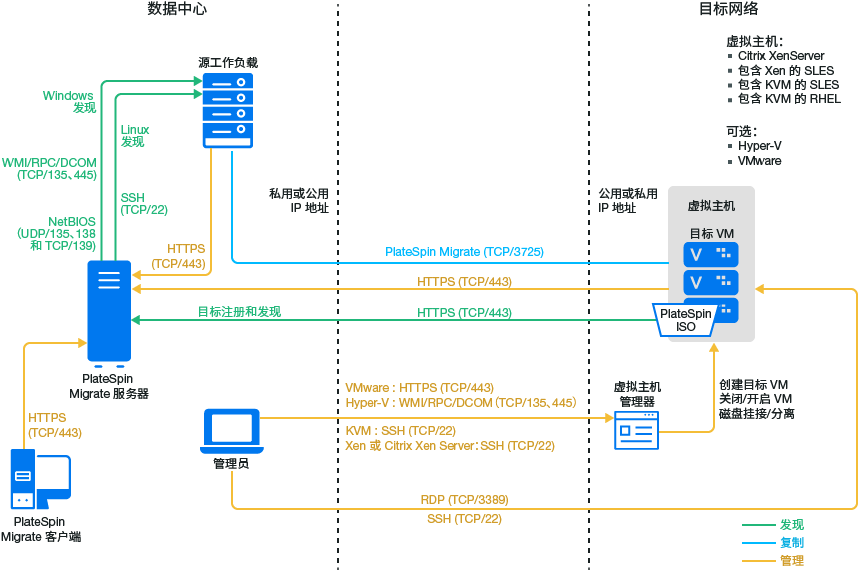 注:图 16-1 描绘了 Windows 和 Linux 工作负载的自动发现和网络要求。您也可以使用源工作负载上的 Migrate 代理来注册工作负载,并使用 HTTPS (TCP/443) 将其库存细节发送到 PlateSpin Migrate 服务器。请参见部分 2.6.2, 工作负载注册的要求和部分 22.7, 使用 Migrate 代理注册工作负载并发现细节。