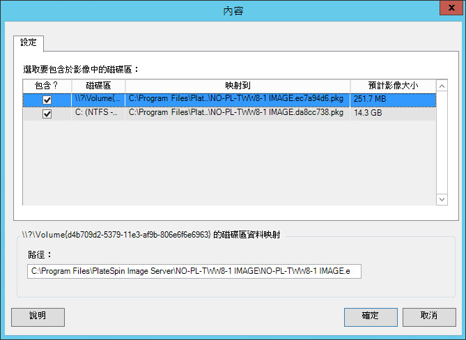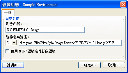 影像組態: 指定影像名稱、影像儲存位置的路徑,以及是否使用 NTFS 壓縮 (在「影像組態」下,按一下一般)。