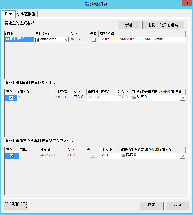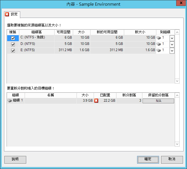 使用以下設定可以選取要複製的來源磁碟區、要重新建立並調整大小的非磁碟區來源空間,以及要重新分割和填入的目標磁碟。