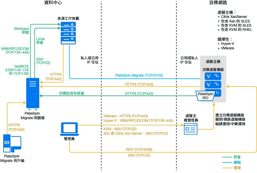 附註:圖 13-1 和圖 13-2 描述了 Windows 及 Linux 工作負載的自動探查和網路要求。您也可以使用來源工作負載上的 Migrate 代理程式來註冊工作負載,並使用 HTTPS (TCP/443) 將其庫存詳細資料傳送至 PlateSpin Migrate 伺服器。請參閱節 2.6.2, 工作負載註冊的要求 和節 22.7, 使用 Migrate 代理程式註冊工作負載並探查詳細資料。