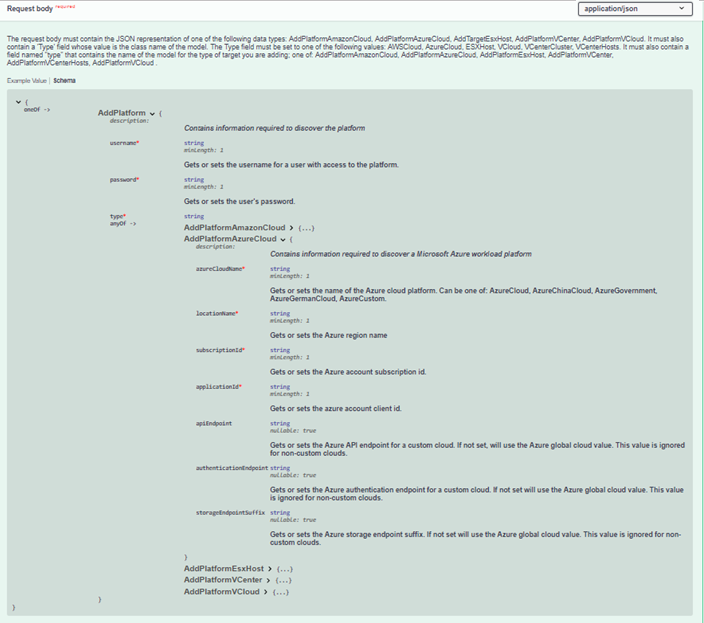The schema definition for AddPlatformAzureCloud indicates what information is needed to add a new Azure location to the Migrate Server. The POST request body would be similar to the following: