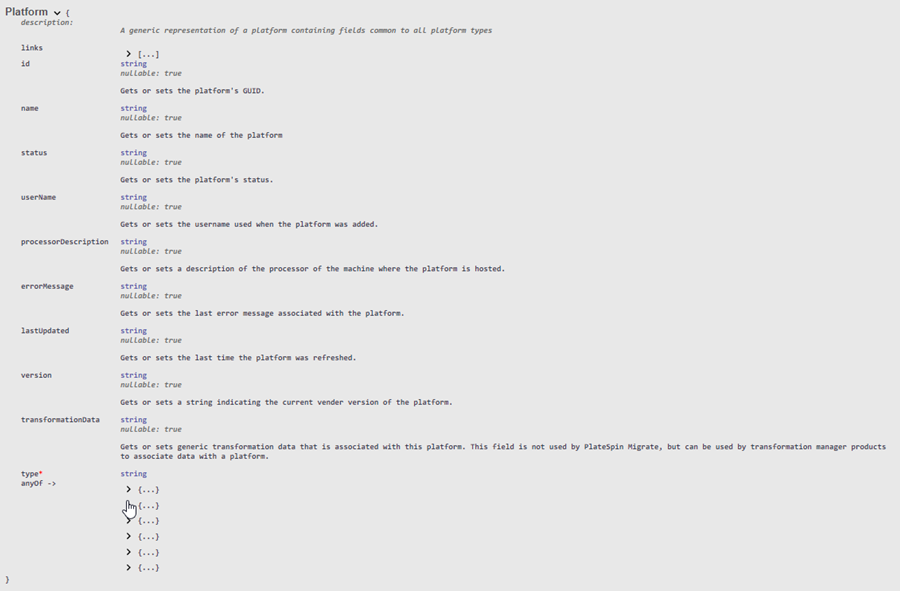 When no details are exposed in the method documentation, you can use the Schemas header at the bottom of the Migrate API landing page, then search for the resource type to view its details.