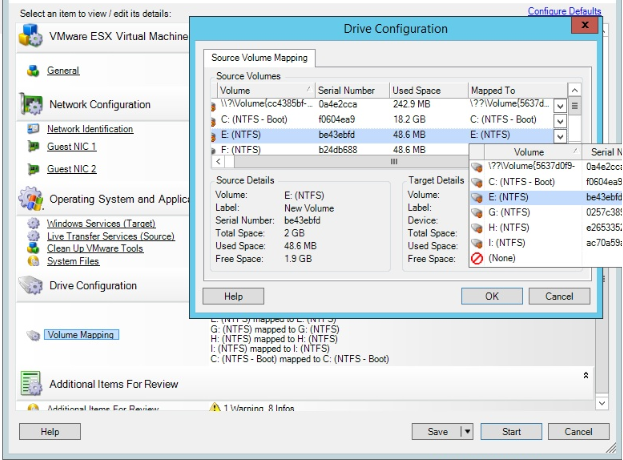 6. In the Drive Configuration section of the Migration Job window, click the Volume Mapping or Drives and Volumes option displayed depending on the target type.