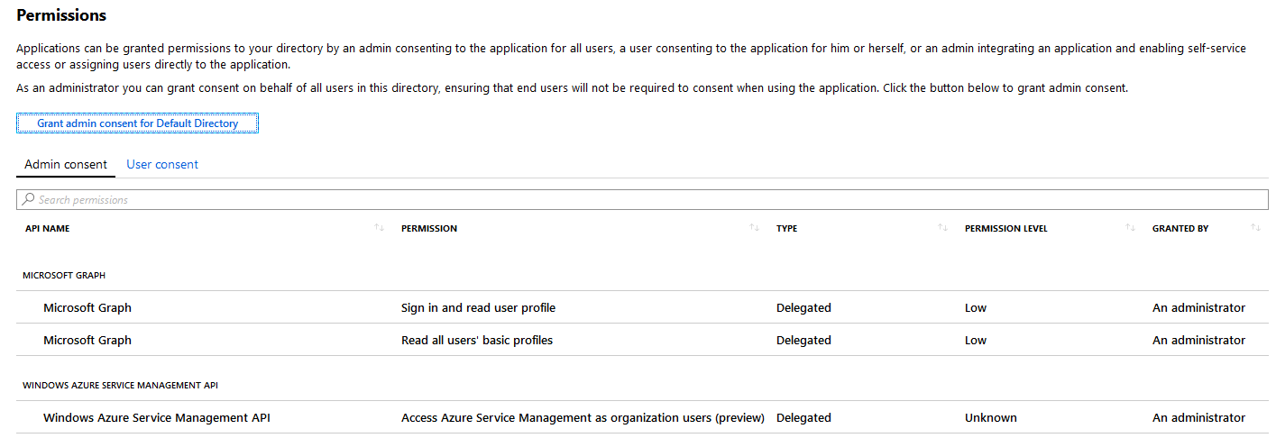 Verify that required permissions are listed in the Admin Consent section and that consent is granted for the Default Directory.