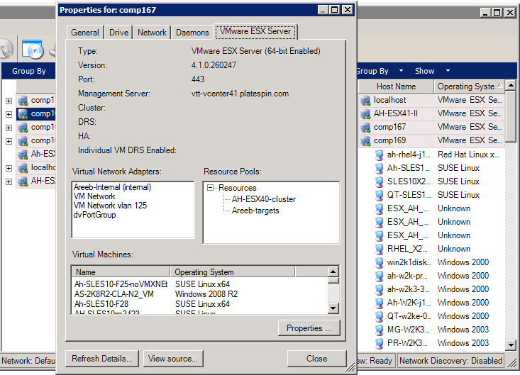 VMware ESX servers that are assigned to a Distributed Resource Scheduler (DRS) cluster provide information about the name of the cluster and the DRS automation level (full, manual, or partially automated). The properties for VMware ESX servers that are part of VMware vCenter platforms also indicate this.