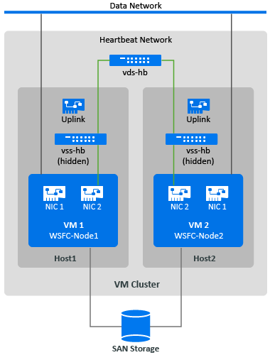 To create a heartbeat network, you can configure vSphere Standard Switches (vSS) identically on each host and add a virtual machine port group for the heartbeat network on each switch. Each host contributes an available NIC to use as the uplink, which is required for communications between nodes across the hosts. You configure the second NIC on each VM to use the heartbeat network.