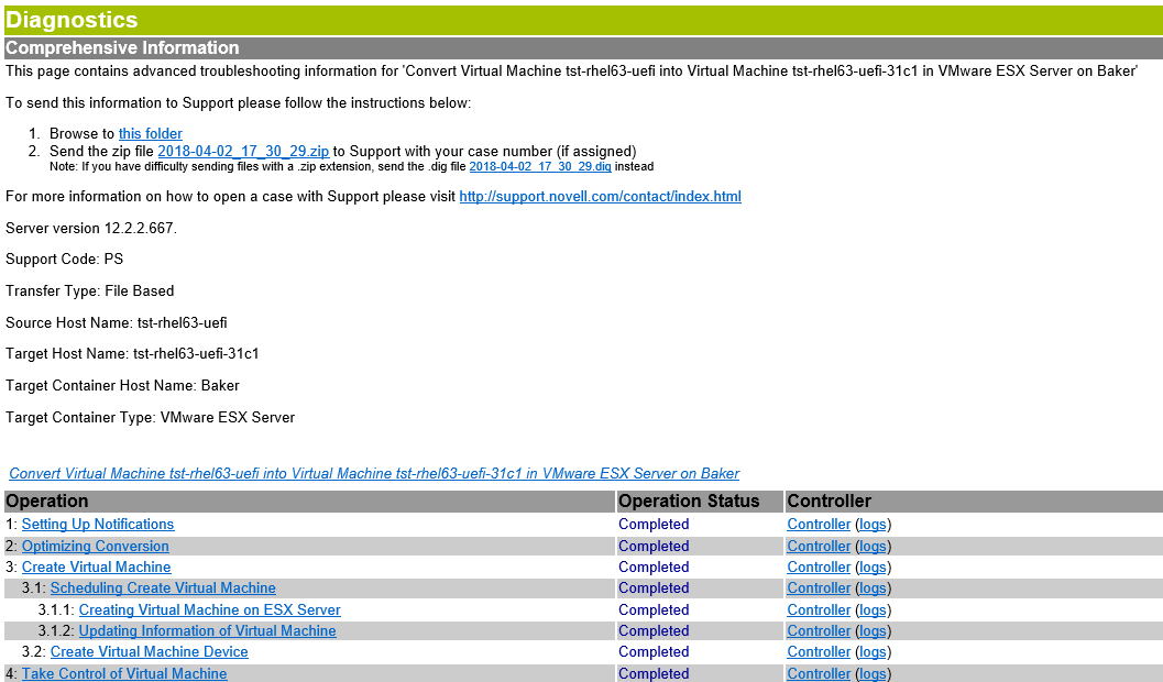 PlateSpin Migrate provides a tool that can produce a diagnostics report for any running or completed job.