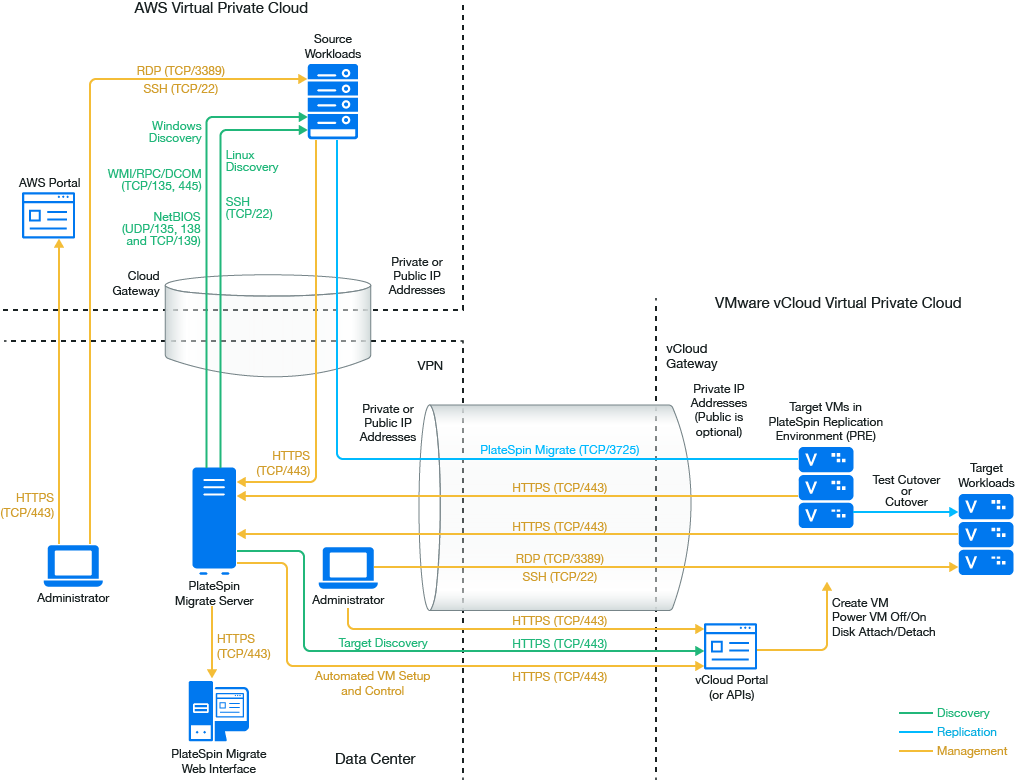 PlateSpin Migrate supports migration of workloads from Amazon Web Services EC2 Cloud to VMware vCloud Director.