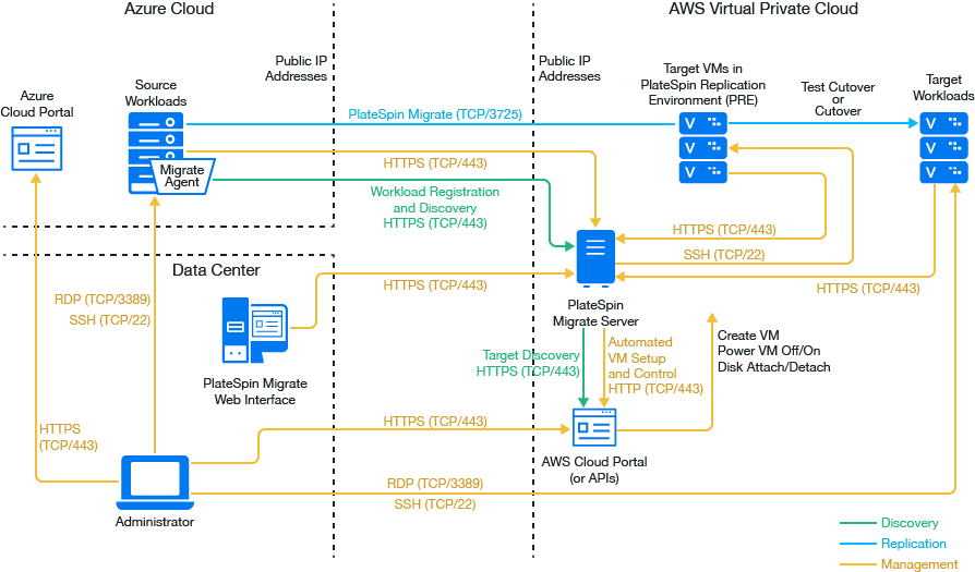 Deploy PlateSpin Migrate server from the Azure Marketplace in the source Azure environment. The Migrate server image in Azure Marketplace is preconfigured to support its host Azure IaaS environment: Azure global or sovereign Azure China. When the Migrate Server and source workloads are in the same network security group, you can use Migrate discovery to add workload details to Migrate. Figure 12-2 shows the location of various components in your AWS, Azure, and data center migration environments and the communications between them.