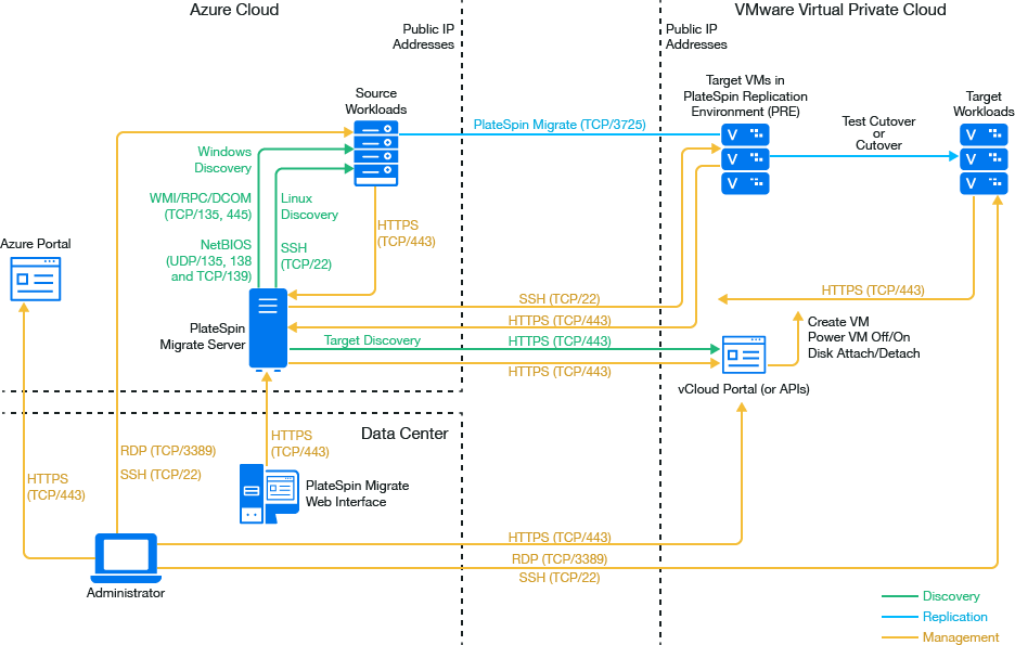 You can alternatively deploy the PlateSpin Migrate server from the Azure Marketplace in the source Azure environment. No VPN is required. With the Azure server in the same network security group as the source workloads, you can use discovery to add workloads to Azure. Use data encryption to secure data for replications over the public Internet. Figure 12-5 shows the location of various components in your Azure, vCloud, and data center migration environments and the communications between them.