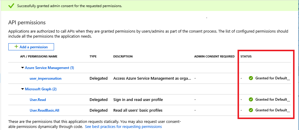 On the API Permissions page, visually verify that the Status shows that the permissions are Granted for Default Directory.