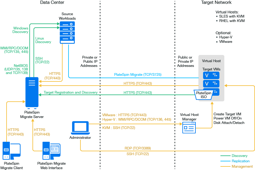 NOTE:Figure 15-1 depicts automated discovery and the network requirements for Windows and Linux workloads. You can alternatively use Migrate Agent on the source workload to register the workload and send its inventory details to PlateSpin Migrate server using HTTPS (TCP/443). See Section 2.6.2, Requirements for Workload Registration and Section 19.7, Registering Workloads and Discovering Details with Migrate Agent.