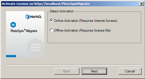 When you launch the PlateSpin Migrate Client for the first time after installation, the License Activation Wizard opens and prompts you to activate your product license.