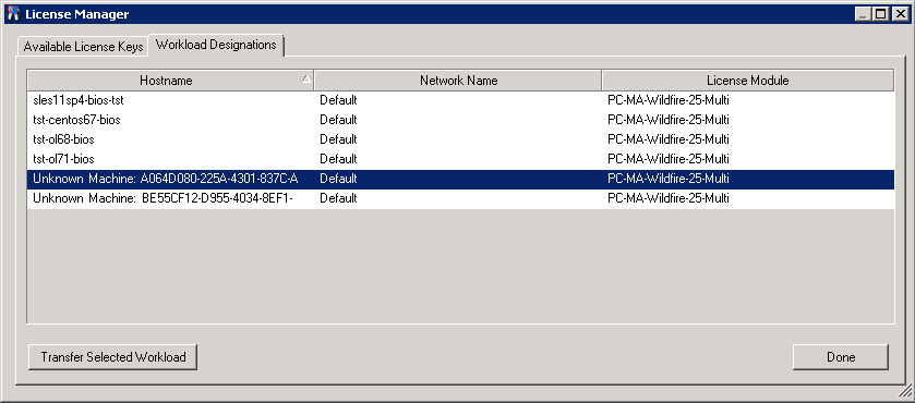 On the License Manager’s Workload Designations tab, select the required workload and click Transfer Selected Workload.