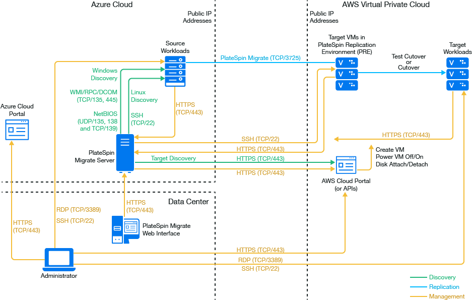 Deploy PlateSpin Migrate server from the Azure Marketplace in the source Azure environment. The Migrate server image in Azure Marketplace is preconfigured to support its host Azure Cloud environment. When the Migrate Server and source workloads are in the same network security group, you can use Migrate discovery to add workload details to Migrate. Figure 12-2 shows the location of various components in your AWS, Azure, and data center migration environments and the communications between them.