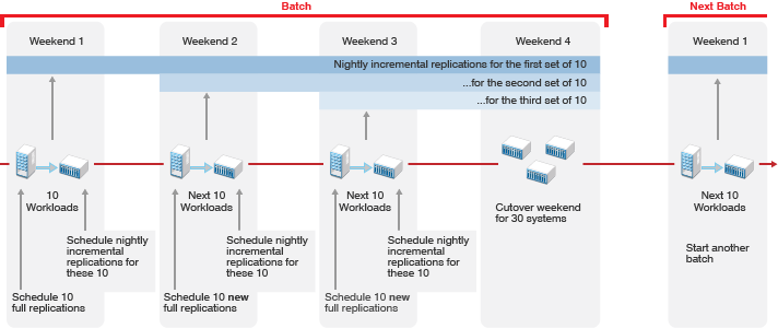 Within a wave, batches group like workloads that you want to transform together. Batches can be more easily scheduled during intervals when Network resources are available. You can deliver valuable results in each batch and wave. Schedules are flexible. You can coordinate the start dates and cutover dates with stakeholders to work around planned events that are critical to the business.