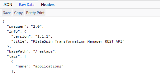 This is the same type of information displayed when you visit the REST API location on your PlateSpin Transformation Manager server at http://<your-ptmserver-ip-address-or-fqdn>:8082/restapi.