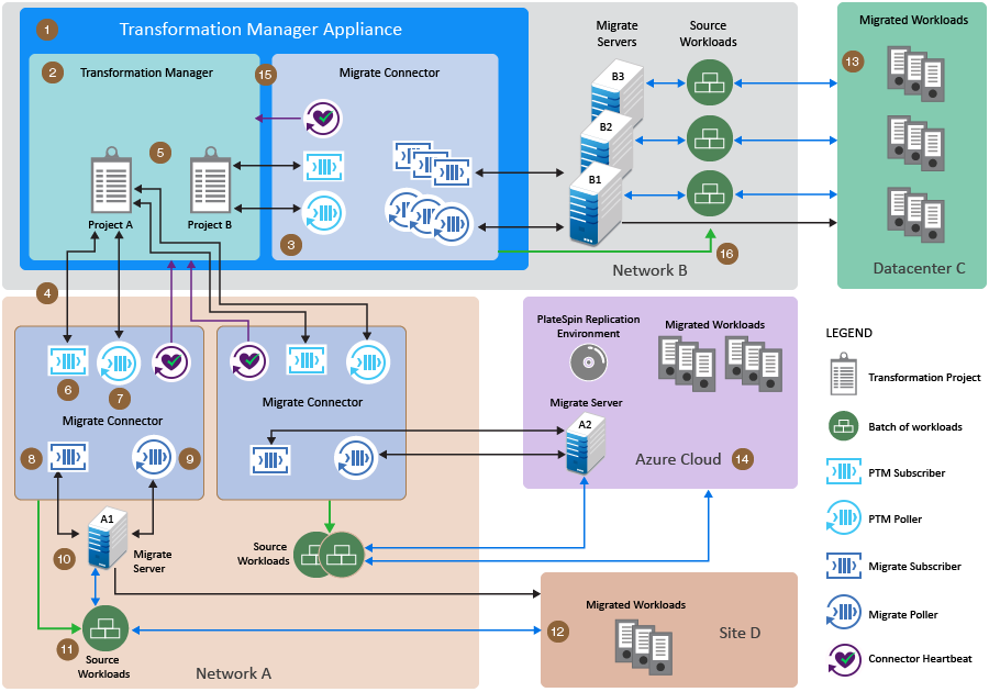 PlateSpin Migrate Connector integrates activities between PTM and Migrate servers. It load-balances the migration jobs across multiple PlateSpin Migrate servers in the project. Migrate Connector listens for migration events from PTM and delivers them to the appropriate Migrate servers. Migrate Connector listens for migration status events from the various PlateSpin Migrate servers and delivers events only to the appropriate project and workload transformation plans.