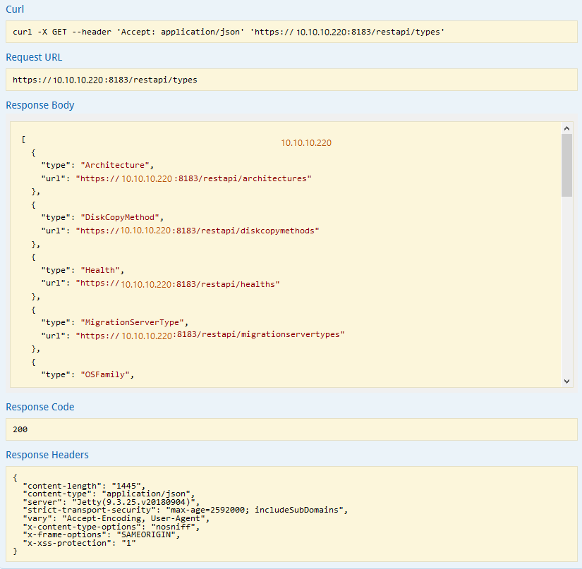 The PlateSpin Transformation Manager REST API interactive console uses the open source Swagger UI tool to provide documentation about its APIs. You can learn about the APIs and interact with the REST service to try them.