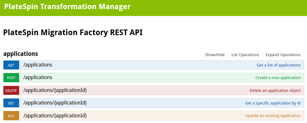 This is the same type of information displayed when you visit the REST API location on your PlateSpin Transformation Manager server at http://<your-ptmserver-ip-address-or-fqdn>:8082/restapi.