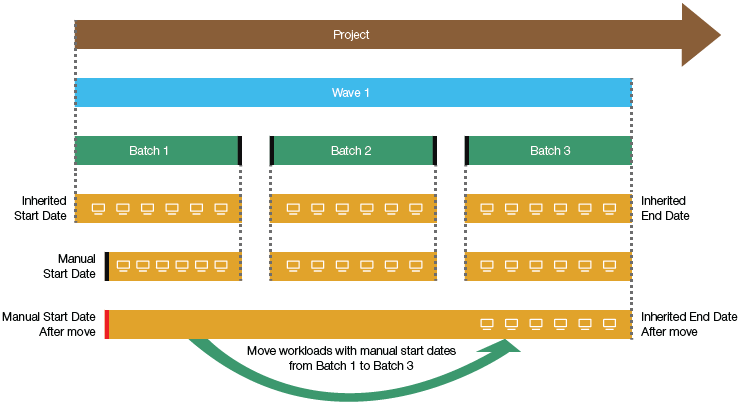 If you set dates manually, the date setting overrides inheritance rules. If you move a workload with a manual date from one batch to another, the manual date setting does not change, but the inherited date setting changes automatically.