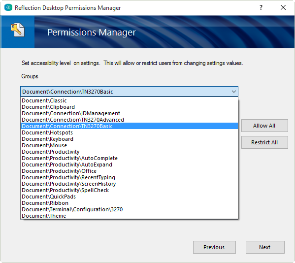 In Permissions Manager, under Groups, select the group of settings you want to control access to (for example, Document\Connection\TN3270Basic).