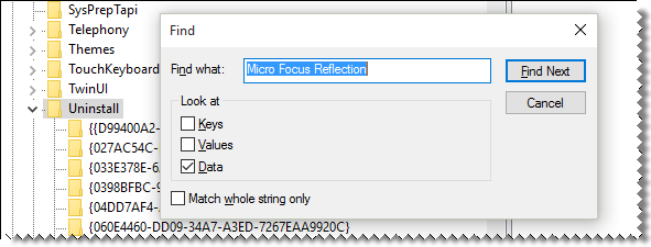 In the Uninstallkey, search for Micro Focus Reflection to locate the GUID associated with the product.