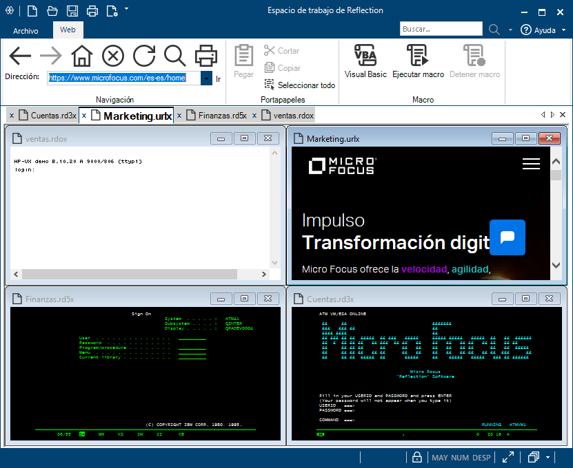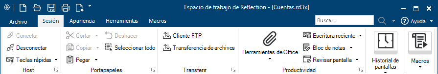 La Cinta tiene el mismo aspecto que los productos de Microsoft Windows y Office. Se accede a las funciones y a la configuración de Reflection mediante la interfaz gráfica ampliada de la Cinta.