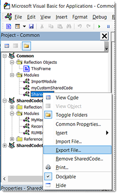 First, you'll need to save the macros you want to distribute in a module in the Common project and then export the module to a .bas file as follows: