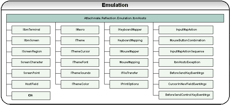 The Attachmate.Reflection.Emulation.IbmHosts namespace includes all of the objects required for working with IBM host terminal emulation. The IbmTerminal is the top-level object in this namespace and represents two types of IBM host emulations: 3270 Mainframe (System z) and 5250 AS/400 (Series i). Most functional areas of the IBM host terminal have a corresponding object that lets you work with that area, such as KeyboardMapper, FileTransfer, and Macro.