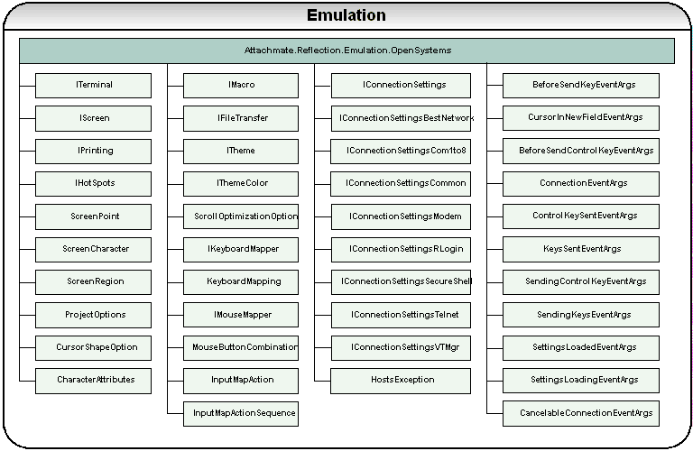 Attachmate.Reflection.Framework is the most important namespace of the API and provides the infrastructure for the API. Framework also provides the entry point to the API (MyReflection) and access to the application via Application objects.