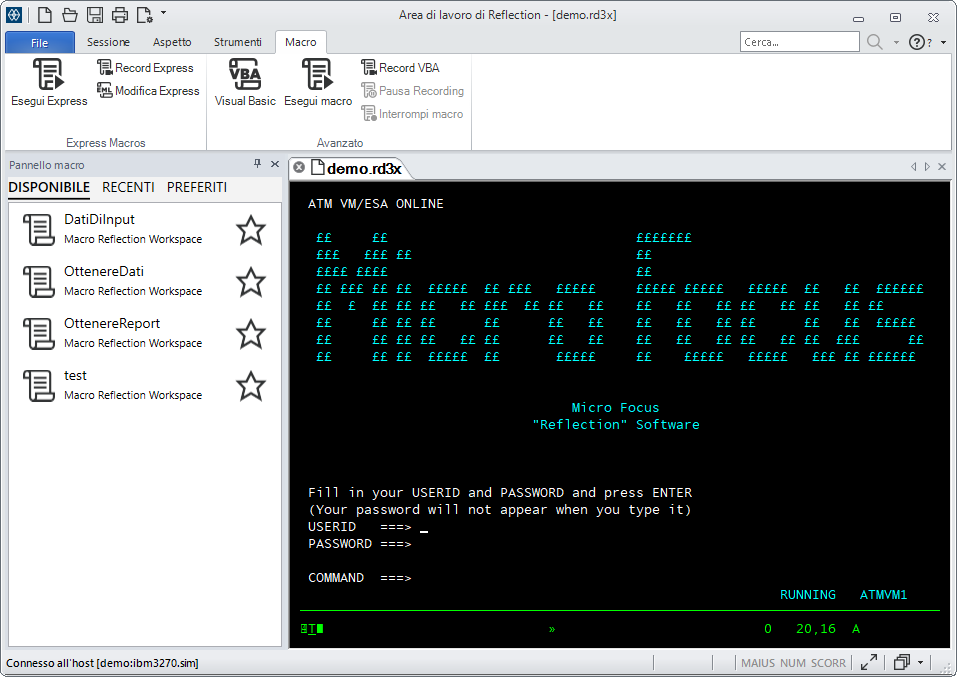 È possibile eseguire le macro VBA create in Reflection e la maggior parte delle macro create con Extra! e i prodotti di Reflection precedenti. È inoltre possibile eseguire la maggior parte delle macro create con Micro Focus Rumba, IBM Personal Communications, OpenText HostExplorer e prodotti di Brandon Systems/Jolly Giant QWS3270. Tuttavia è possibile eseguire le macro solo nei percorsi attendibili.