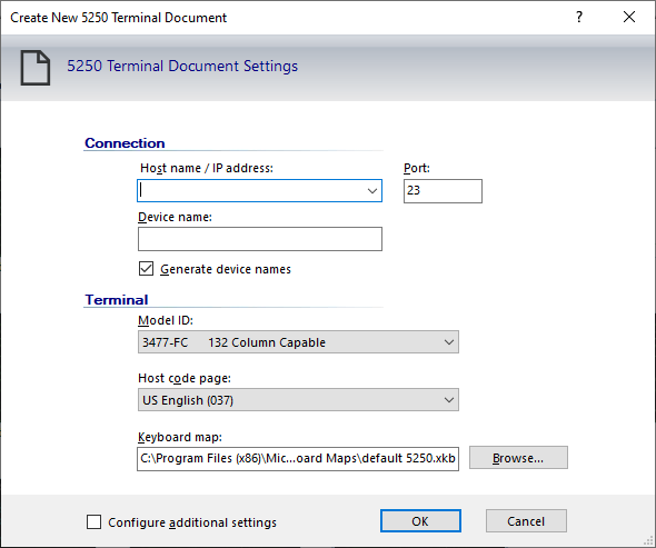 Finestra di dialogo Crea nuovo documento del terminale 5250