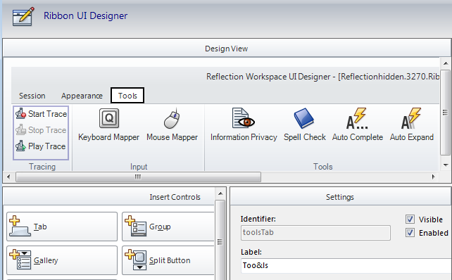 2. In the Reflection UI Designer window, select the control you want to work with (for our example, we'll select the Tools tab).