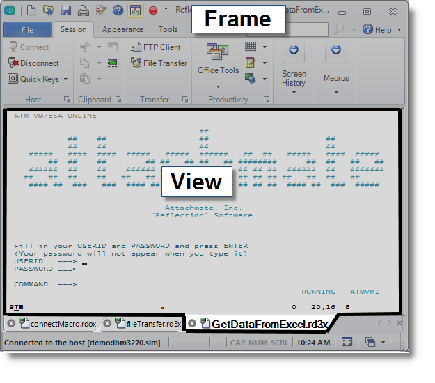 Sub CheckViews() Dim osTerminal As Attachmate_Reflection_Objects_Emulation_OpenSystems.Terminal Dim ibmTerminal As Attachmate_Reflection_Objects_Emulation_IbmHosts.ibmTerminal Dim webCntrl As Attachmate_Reflection_Objects.WebControl Dim sessionName As String Dim views() As Attachmate_Reflection_Objects.View Dim osView As Attachmate_Reflection_Objects.View 'Catch error if sessions are not open On Error GoTo MyHandler 'Get the view and terminal control from the session path and filename sessionName = Environ$("USERPROFILE") & "\Documents\OpenText\Reflection\" & "GetDataFromExcel.rd3x" views = ThisFrame.GetViewsByFilePath(sessionName) Set ibmTerminal = views(0).control 'Get the view and terminal control from the title text on the view's tab sessionName = "osSession.rdox" Set osView = ThisFrame.GetViewByTitleText(sessionName) Set osTerminal = osView.control Exit Sub 'If a session is not open, send a message to open it and then exit MyHandler: MsgBox "You need to open" & sessionName Exit Sub End Sub |