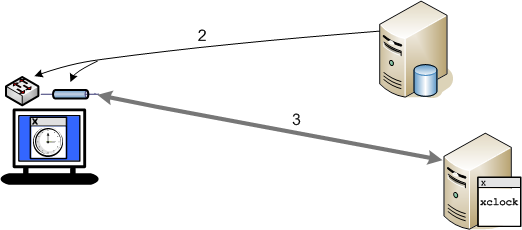 Le protocole X circule directement du client X à la session sur la station de travail. (Voir la flèche 3 dans l'illustration suivante.)